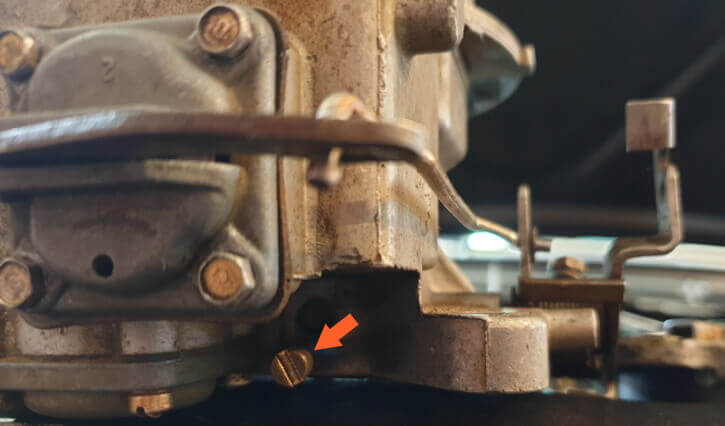 On the stock Autolite 2100 carb, you’ll find the idle screws at the front bottom of your carb: